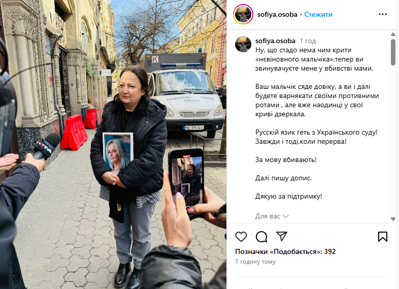 "Ну, что стадо нечем крыть "невиновного мальчика", теперь вы обвиняете меня в убийстве мамы. Ваш мальчик сядет пожизненно, а вы и дальше будете варнякать своими противными ртами, но уже наедине в свои кривые зеркала. Русский язык прочь из Украинского суда! Всегда и тогда, когда перерыв! За язык убивают!", - написала Семчишин-Особа.