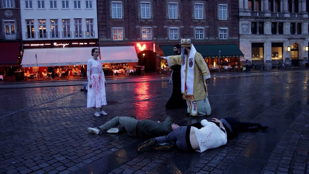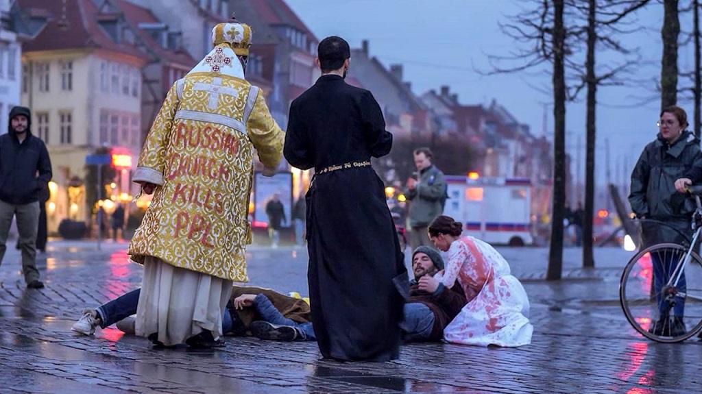 На центральной площади Копенгагена состоялся перформанс "Russian church kills", призванный рассказать о преступлениях российской церкви в войне рф против Украины.