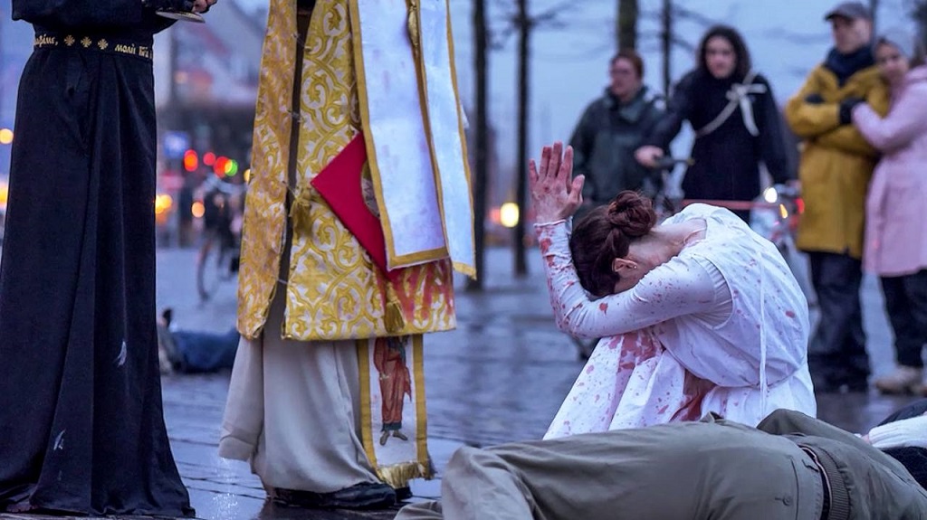 Актер в образе патриарха Кирилла под звуки взрывов и сирен со словами "Мир всем!" окроплял "кровью" олицетворение Мира. Действо символизировало кровавую войну, развернутую россией с ее многочисленными жертвами среди гражданских украинцев. Действо совмещало танец с актерской игрой и музыкальным сопровождением.