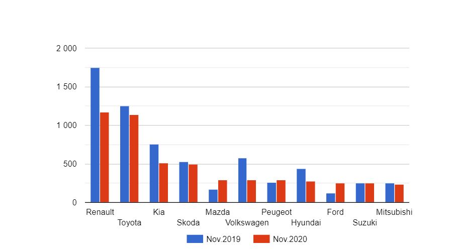 Отметим, что бестселлером ноября стал автомобиль Toyota RAV4 с показателем 532 регистрации.