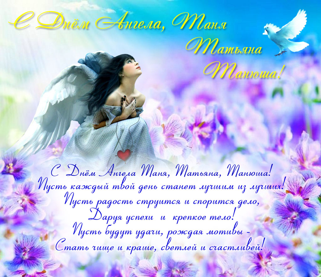 От всей души поздравляю тебя с днем ангела! Пусть все земные блага подарит тебе судьба, а жизненный путь будет подобен небесному полету: будет таким же легким, ровным и спокойным. От природы Татьяны все мечтатели, так пусть твои мечты долетают до звезды исполнения желаний и, исполнившись, падают со скоростью метеоритного дождя тебе в ладони. С праздником, Татьяна!