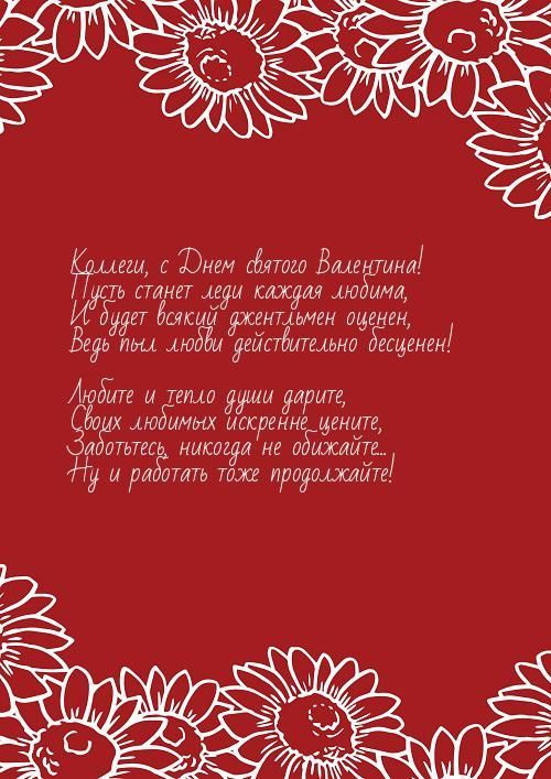 Коллеги, поздравляю вас с праздником, с днем святого Валентина! Желаю найти свою вторую половинку, духовную близость, искреннюю любовь, взаимопонимание, поддержку, радость в семье. Умейте получать удовольствие от общения, осязания и улыбки. Проведите время с близкими, сделайте этот день незабываемым. Любите и будьте любимыми!