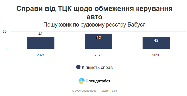 В Украине отмечается стремительный рост числа судебных дел об ограничении права на управление автомобилем за нарушение правил воинского учета. Только с начала 2026 года было возбуждено 42 таких дела, что уже превышает показатель за весь 2024 год.