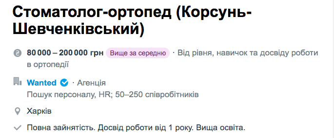 В Украине стоматологу-ортопеду готовы платить от 80 000 до 200 000 гривен с возможностью картерного роста.