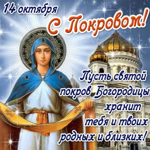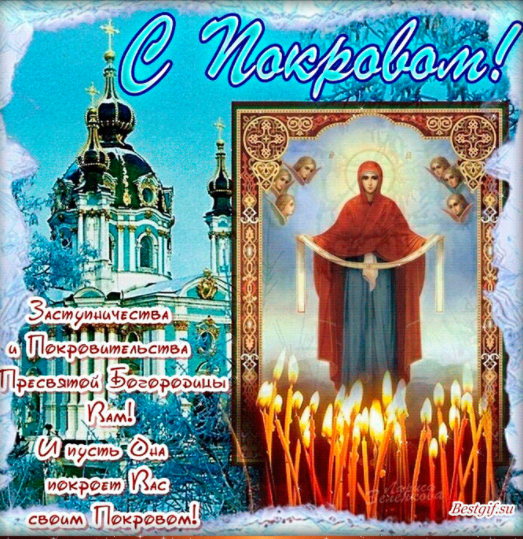 Поздравляю с праздником Покрова Пресвятой Богородицы. Желаю благодати в жизни, любви в сердце, гармонии в душе и надежного покрова от всех ненастий, бед, обид и злоб.