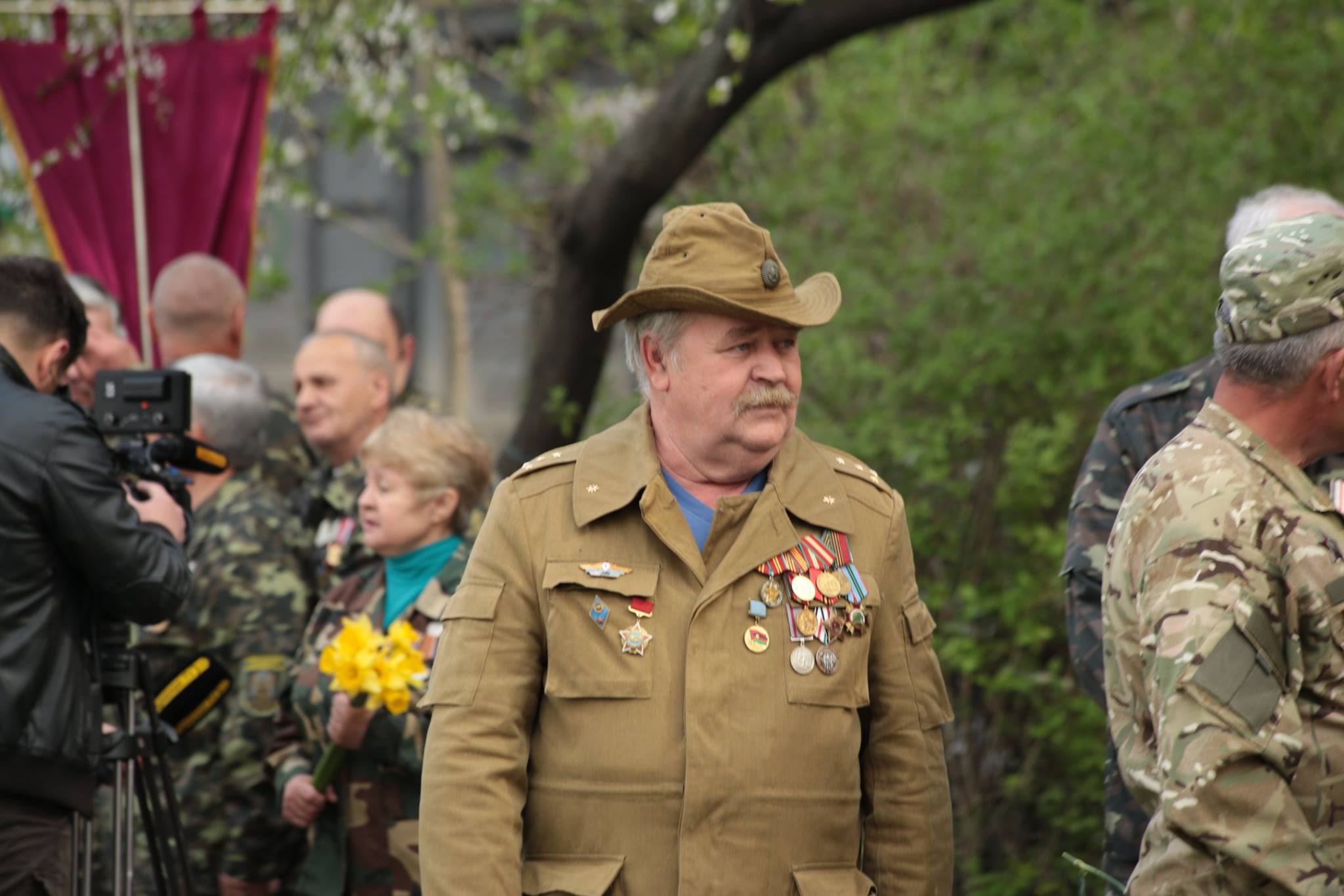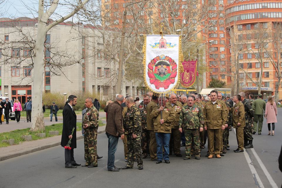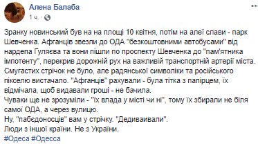 "Утром Новинский был на площади 10 апреля, затем на аллее славы - парк Шевченко. Афганцев свезли в ОГА "бесплатными автобусами" от нардепа Гуляева и они пошли по проспекту Шевченко к "памятнику импотенту", перекрыли дорожное движение на важной транспортной артерии города. Полосатых лент не было, но советской символики и российского пикселя хватало. "Афганцев" считали - была тетка с бумажкой, их отмечала, чтобы выдавали деньги - не видела. Чуваки еще не поняли - "их власть в городе или нет", поэтому их собирали не у самой ОГА, а через улицу. Ну, " пабедоносцов" вам в ленту. "Дедываивали". Люди из другой страны. Не из Украины", - написала волонтер.