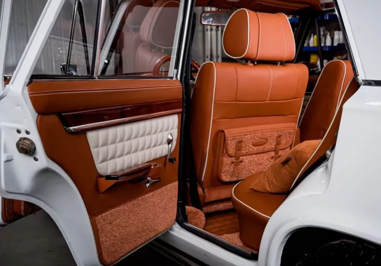Взамен обычных сидений "Копейка" получила комфортабельные от Toyota. Сидения обшиты натуральной кожей светло-коричневого цвета с белыми вставками. В таком же стиле оформили и весь салон, а место штатных пластиковых элементов заняли деревянные.
