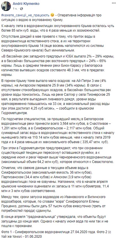 "По подсчетам специалистов, за прошедший месяц в Белогорское водохранилище реки принесли всего 3,564 млн кубов, в Счастливое - 1,201 млн кубов, а в Симферопольское - 2,117 млн кубов. Общий суммарный запас воды в водохранилищах естественного стока к началу нынешнего лета на 110.14 млн кубов меньше, чем к началу лета 2019 года и в 4 раза меньше их максимального объема ( 335,47 млн. куб)", - написал Клименко у себя в Facebook.