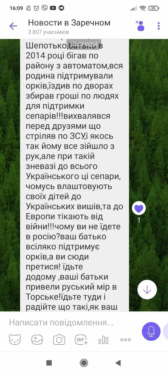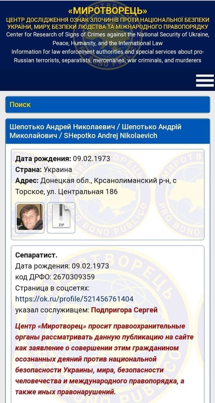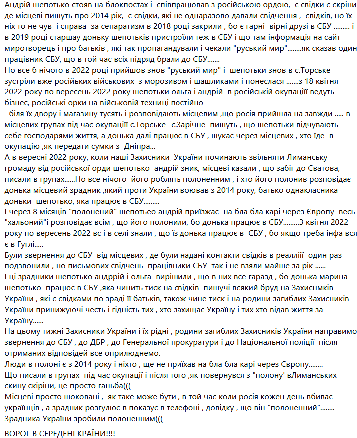 "Свидетели есть, скрины, где местные пишут о 2014 году, есть свидетели, которые не раз давали показания, свидетелей, но их никто не слышал и дело за сепаратизм в 2018 году закрыли, потому что есть хорошие верные друзья в СБУ... И в 2019 году старшую дочь Шепотьков пристроили тоже в СБУ, и что там информация на сайте Миротворец и о родителях, которые так пропагандировали и ждали "русский мир"... Как сказал один работник СБУ, что в то время всех подряд брали в СБУ...", - говорится в сообщении.