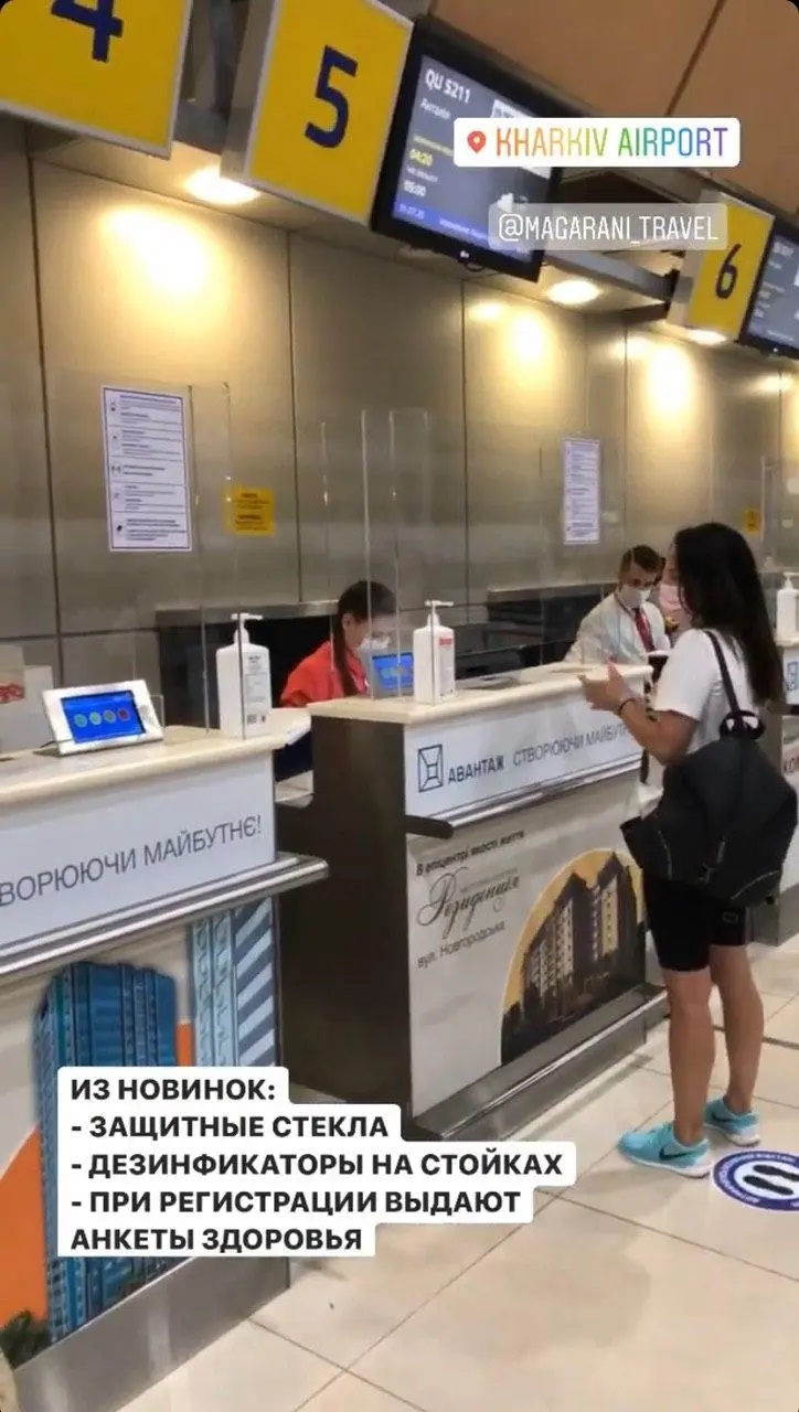 По словам пассажиров, регистрация на рейс проводится, как обычно, только на входе в терминал нужно измерить температуру и заполнить анкету здоровья. В помещении аэропорта установлены защитные стекла на стойках регистрации, доступны дезинфекторы.