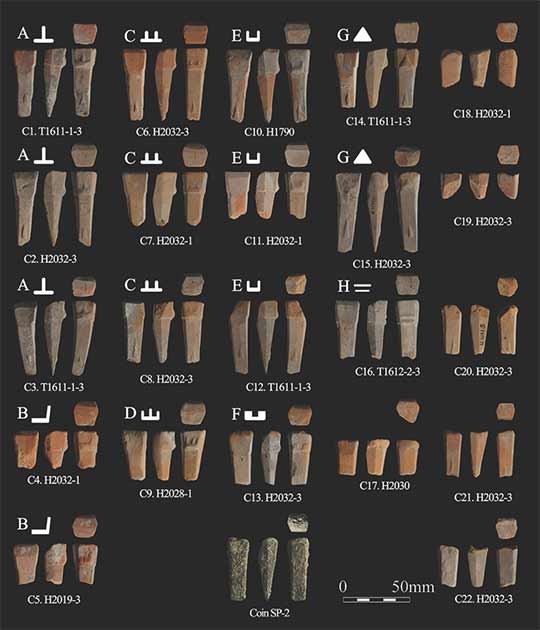 Группа археологов наткнулась на мастерскую по производству изделий из бронзы, где нашли различные формы для чеканки монет, а также фрагменты самих "монет-лопат" и металлические отходы производства.