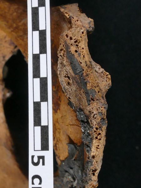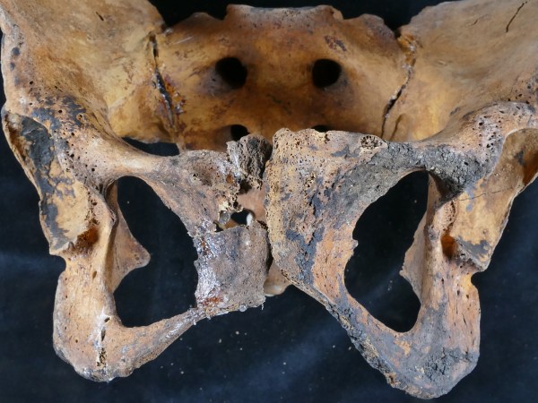 Между перевязанными ногами, в нижней части таза и под льняной повязкой, исследователи обнаружили керамическую чашу со следами использования, содержащую обугленные органические остатки. Анализ скелетных останков подтвердил, что женщина пережила серьезный перелом таза, возможно, вызванный падением, которое должно было вызвать сильную боль.