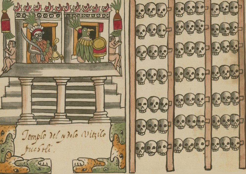 Археологи нашли в Мехико, что в древние времена было столицей ацтеков Теночтитлан, стеллаж (Hueii Tzompantli или цомпантли) для черепов военнопленных или других жертв для публичного показа и еще для жертвоприношения.
