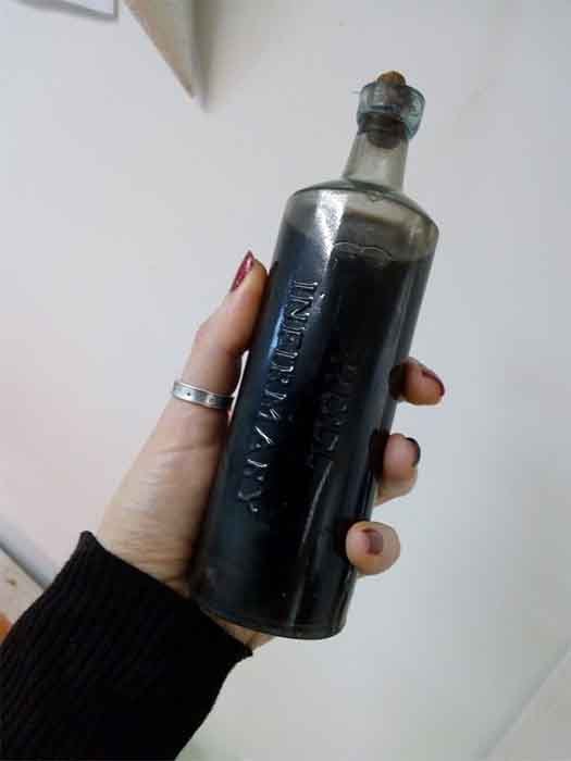 Полностью неповрежденная, запечатанная бутылка была сделана из стекла синего цвета. На ней было написано "Больница Корпуса". Археологи сообщили, что бутылка, по всей видимости, была "намеренно помещена" в могилу, между чьими-то ногами. Что добавляло загадочности к этой тайне, так это то, что сосуд содержал загадочную коричневую жидкость.