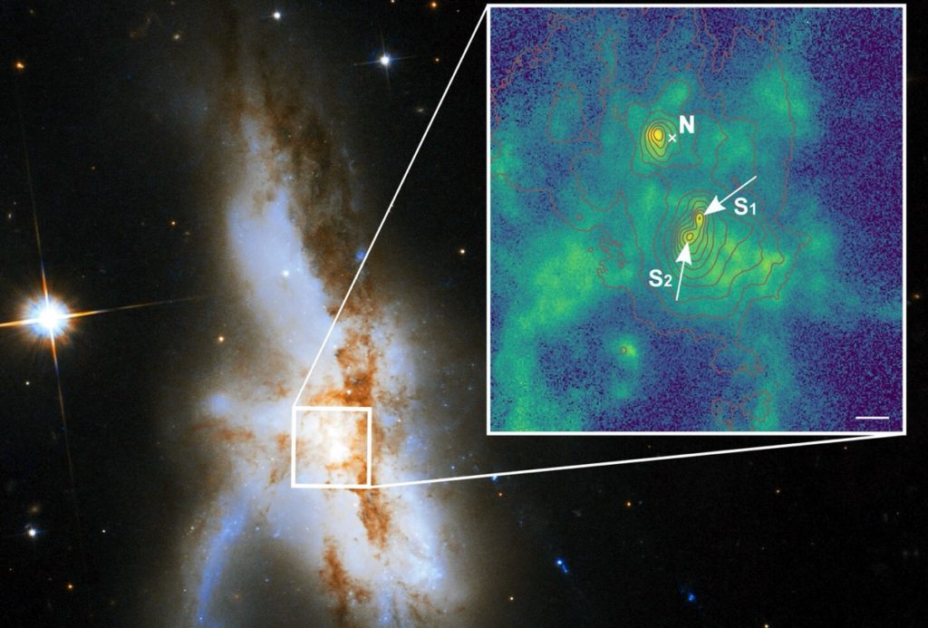 Такую находку сделали специалисты в гигантской ультраяркой галактике NGC 6240, которая находится от нас в 300 миллионах световых лет. Еще в 1980-х астрономы выяснили, что она является продуктом слияния двух систем поменьше и содержит сразу две сверхмассивные черные дыры в своем активном центре.