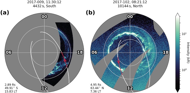 Группа астрономов во главе с Александром Бадером опубликовала результаты анализа данных, собранных межпланетной станцией "Кассини" во время близких пролетов рядом с планетой, в рамках "Большого финала" своей миссии. Аппарату удалось при помощи своих камер получить наиболее детализированные изображения полярных сияний на Сатурне на сегодняшний день и проследить их динамику. В частности, выяснилось, что форма главной дуги может быть как относительно гладкой, так и рифленой, в зависимости от текущего состояния магнитосферы, которая может быть как спокойной, так и возмущенной. За диффузное свечение, окружающее самые яркие области сияний, ответственны потоки энергетических электронов из экваториальной плоскости, которые проникают в атмосферу Сатурна. На сумеречной стороне планеты наблюдалось множество маленьких дуг и сгустков, которые не могут быть объяснены в рамках существующей динамической модели сияний на Сатурне.