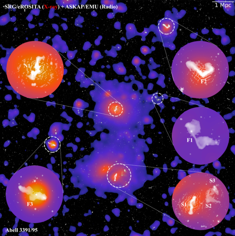 Также на радиоизображениях от ASKAP в Западной Австралии можно увидеть отдельные галактики, попадающие в скопления. На них видны согнутые и искаженные струи, поскольку они сбиваются межгалактическими ветрами в плотном газе в скопления.