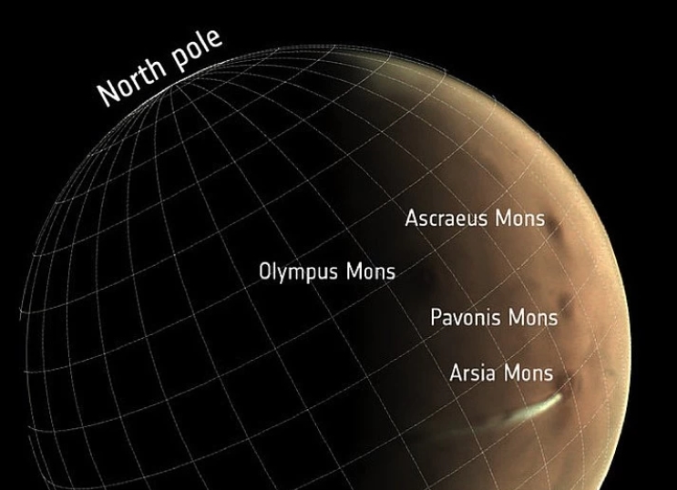 Над 20-километровым марсианским вулканом Arsia Mons в середине июля появился густой шлейф, который вытянулся примерно на 1800 километров под небольшим углом к экватору.
