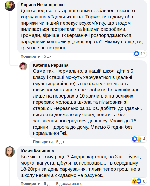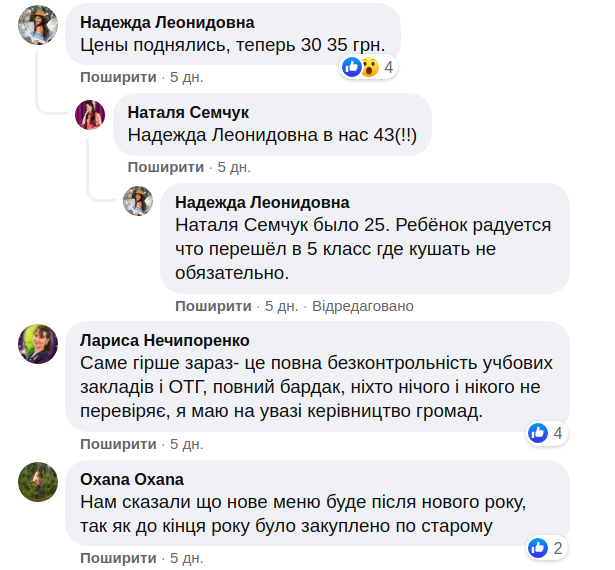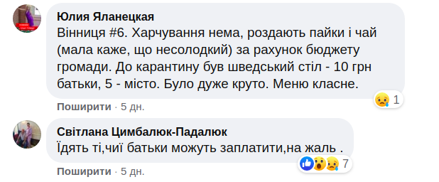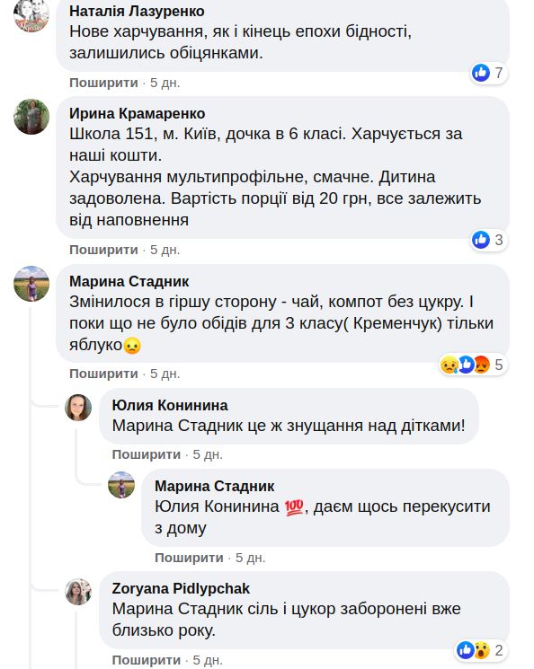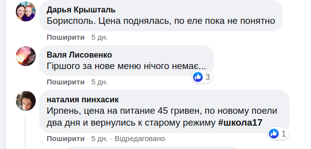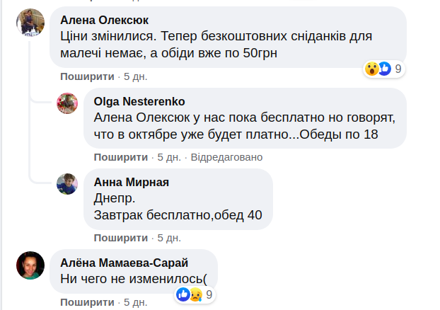 Относительно цен родители говорят разное. Кто-то - что завтраки бесплатные, а уже за обеды нужно платить 40-50 гривен, а кто-то - что сначала было бесплатно, но уже в октябре вернут платное. Иронизируют, что, к сожалению, едят те, чьи родители могут заплатить.