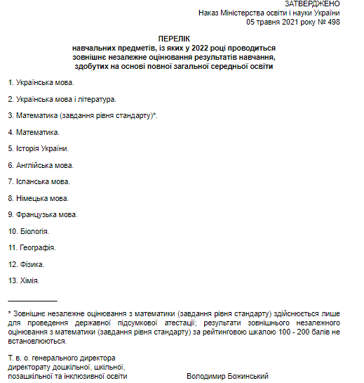 Перечень учебных предметов, по которым в 2022 году будет проводиться ВНО: