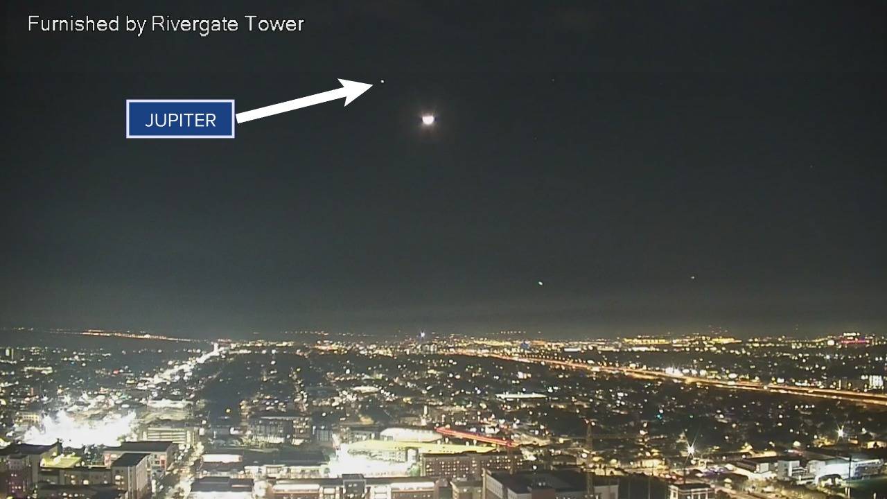 Наблюдать за небесной "парой" можно было и без телескопа. Юпитер имел вид яркого бледно-желтого шара и располагался чуть левее Луны.