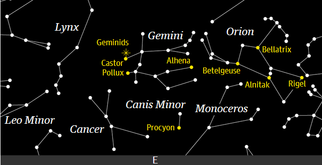 "На диаграмме показан вид на восток из Лондона в 21:00 по Гринвичу 14 декабря. С северного полушария Геминиды заметны тем, что они часто активны до полуночи, что делает их легко заметными даже случайным наблюдателям", - сообщило издание.