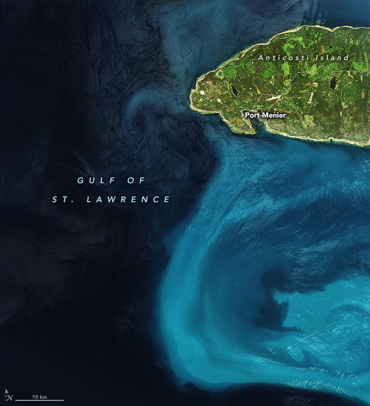 По словам ученых, бирюзовые шлейфы воды в заливе святого Лаврентия появляются благодаря фитопланктону, который там обитает.