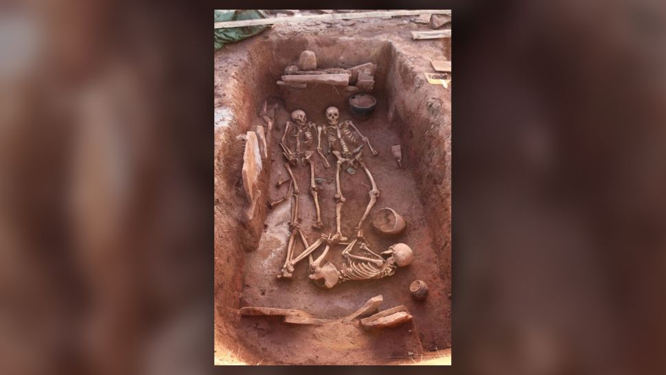 Археологи нашли могилу, где около 2,5 тысяч лет назад похоронили мужчину, двух женщин и ребенка. Там же нашли и тайник с сокровищами, включая бронзовые кинжалы, ножи и топоры.