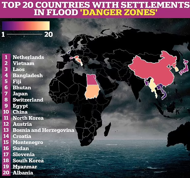 При этом исследователи озабочены тем, что поселения расширяются в зоны затопления, а отнюдь не удаляются от них, что представляет угрозу жизни в ближайшем будущем. Так, риск наводнений особенно высок для стран, где поселения сосредоточены вдоль речных долин и бассейнов. Речь идет, в частности, о Бутане, Египте и Бангладеш. А также прибрежных территориях, таких как Фиджи и Вьетнам .