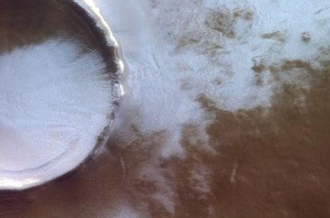 Из-за того, что снимок был сделан ранним марсианским утром, солнечный свет отображается в залежах льда в кратере и производит яркое впечатление. Лед покрывает дно этого марсианского кратера, стенки и частично окружающую поверхность.