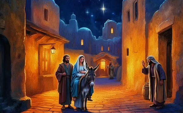 В вертепе Мария и Иосиф часто изображаются путешествующими в Вифлеем верхом на осле. Однако Библия вообще не упоминает осла.