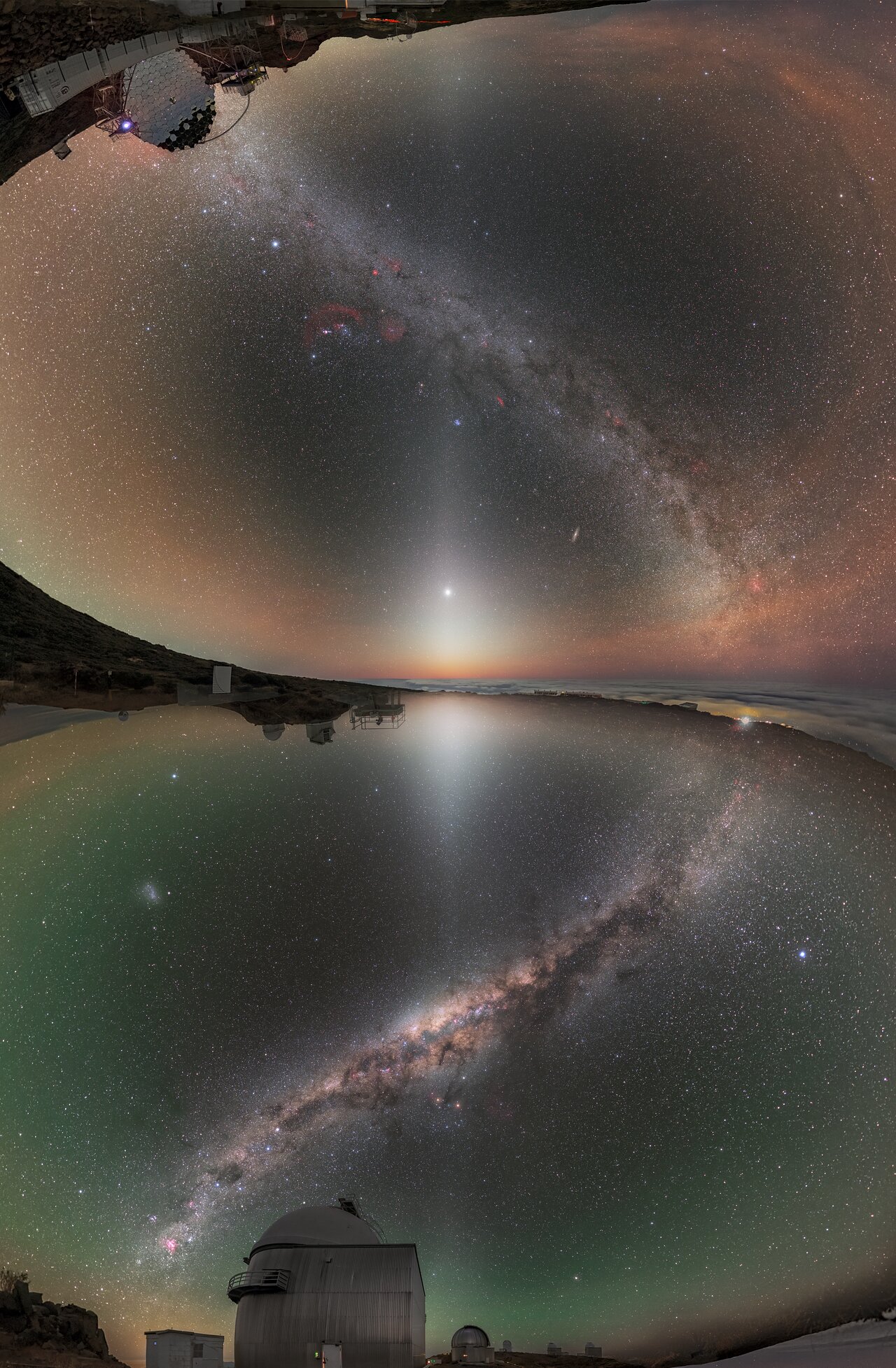 Часть уникальной фотографии сделана в обсерватории Роке де лос Мучачос на острове Ла Пальма в Канарском архипелаге (29 градусов к северу от экватора), а другая - в обсерватории ESO Ла Силья в чилийской пустыне Атакама (29 градусов к югу от экватора).