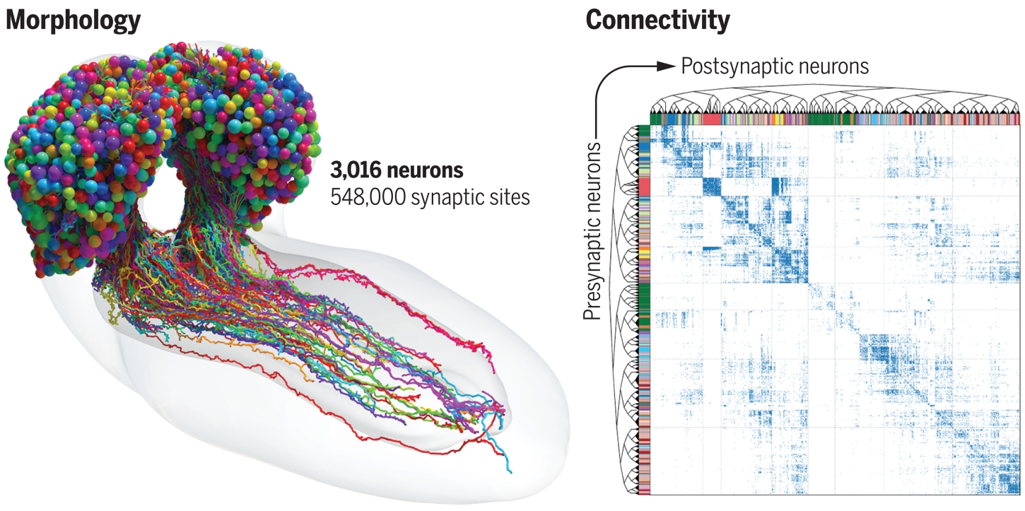Чтобы создать эту карту, исследователи отсканировали тысячи срезов мозга детеныша плодовой мушки с помощью электронного микроскопа высокого разрешения. Затем они объединили изображения и добавили их к уже собранным данным, тщательно отмечая каждую связь между нейронами.