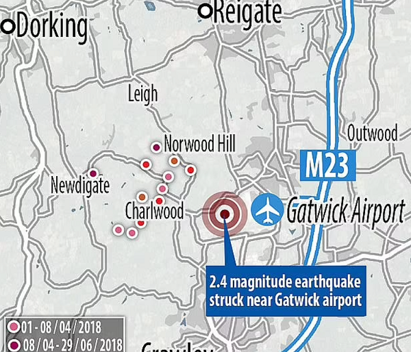 Серия подземных толчков сотрясала Ньюдигейт и ближайшие районы с апреля 2018 года до начала 2019 года. Жители рассказали, что их "мебель очень дрожала" и "все двигалось то вперед, то назад". Другие рассказывали о "громком и сильном ударе и тряске, словно что-то упало на дом" и "общем гуле, который длился несколько секунд".