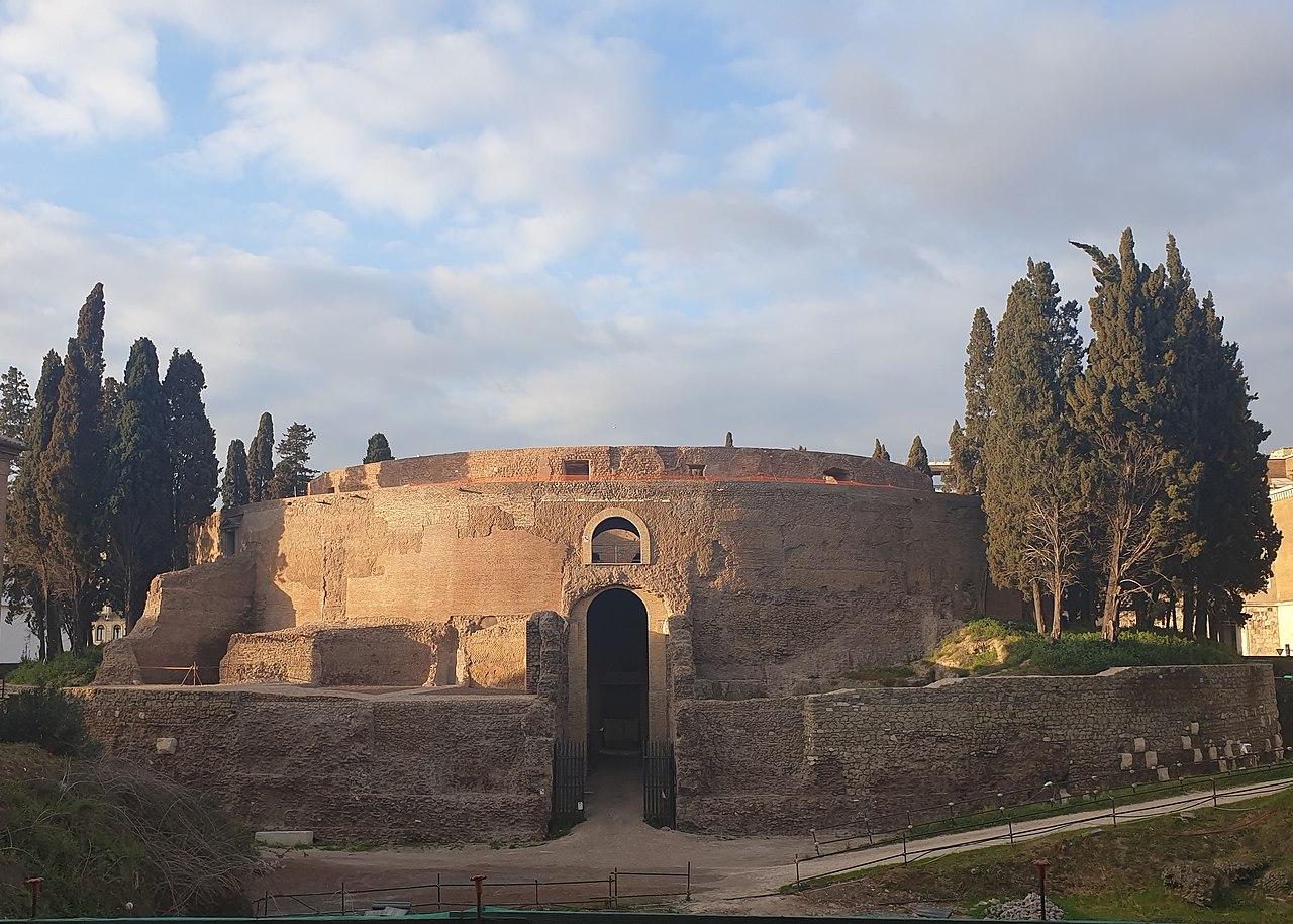 Для справки: Октавиан Август начал строить усыпальницу для себя и своих близких в центре Марсового поля в 28 году до н. э. Строение из травертина повторяло форму этрусских могильников: в его основе располагалось цилиндрическое строение диаметром 87 м, над ним возвышались барабаны меньшего диаметра (общая высота составляла 44 м), последний барабан был увенчан статуей императора. Внутри хранились урны с прахом членов императорского рода: здесь были похоронены сам император, его жена Ливия, сестра Октавия, племянник Марцел, а также императоры Тиберий, Клавдий и Нерон, а также другие представители рода Юлиев-Клавдиев и известные римские особы.