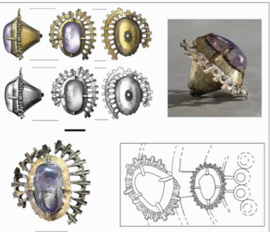Изящное украшение содержит яркий аметист в огранке кабошон в изысканной конусообразной оправе с нежным ореолом из ажурных лучей или лепестков. Ученые провели спектрографический анализ, который показал, что серебряная оправа была позолочена ртутью. Эта токсичная, но распространенная в Средневековье техника использовалась для достижения золотистого вида серебряных предметов.