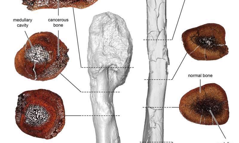 Также команда провела компьютерную томографию (КТ) кости. Затем исследователи разрезали окаменелую кость и рассмотрели ее под микроскопом, чтобы дать оценку на костно-клеточном уровне. Для визуализации прогрессирования рака были использованы инструменты КТ для трехмерной реконструкции. В итоге, ученые пришли к выводу, что у исследуемого динозавра была одна из разновидностей рака – остеосаркома.