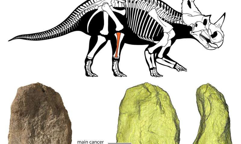 По словам исследователей, рак был обнаружен в малоберцовой кости центрозавра (Centrosaurus apertus), рогатого динозавра, который жил на Земле примерно от 76 до 77 млн лет назад. Останки динозавра были найдены в 1989 году и считалось, что сильно искаженная кость была результатом перелома.