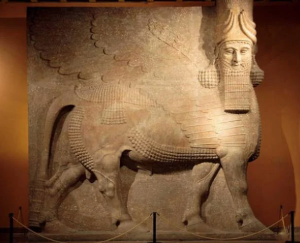 Крылатый бык с человеческой головой, известный как Ламассу из Дур-Шаррукина. Неоассирийский период, ок. 721–705 до н.