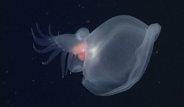 Новый вид Bathydevius, который размером с яблоко, светится биолюминесценцией, имеет тело с хвостом, похожим на весло, и большой трясущийся капюшон. Это первая морская улитка, найденная в глубинах океана. Как правило, морские улитки живут на морском дне или в прибрежных средах, и лишь некоторые из них живут в открытой воде у поверхности.