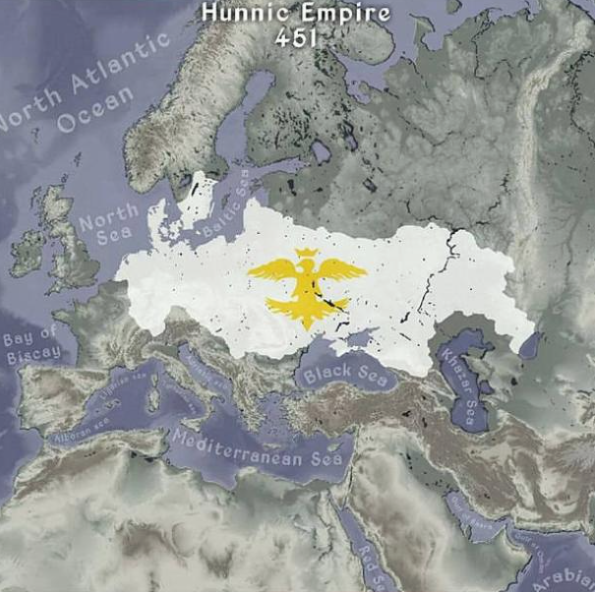 Карта, показывающая полную территорию империи гуннов в 451 году нашей эры, в конце периода правления Аттилы