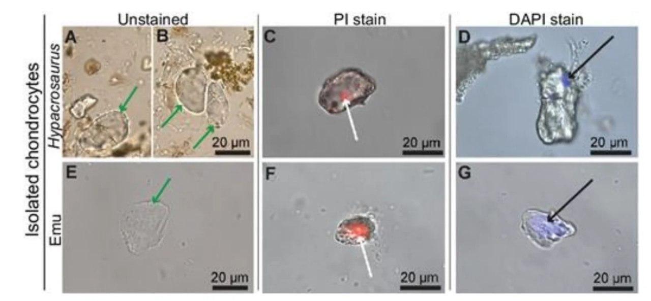Палеонтологи из Китайской академии наук и Университета штата Северная Каролина, исследуя хрящ динозавра возрастом примерно 75 млн лет, обнаружили скопление клеток, в которых есть что-то похожее на хромосомы.