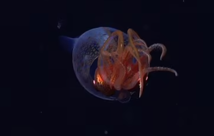 Снятый в морских глубинах потрясающий фильм показывает прозрачное тело и восемь розовых щупалец редкого существа.