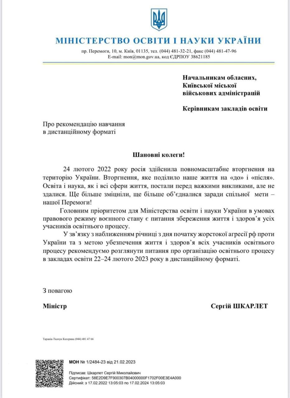 "С целью обеспечения жизни и здоровья всех участников образовательного процесса, как превентивное мероприятие перед годовщиной начала войны России против Украины, обратился к начальникам областных и Киевской городской военных администраций, руководителям учебных заведений с рекомендацией с 22 по 24 февраля 2023 года организовать образовательный процесс учебных заведениях в дистанционном формате", - сказано в сообщении.