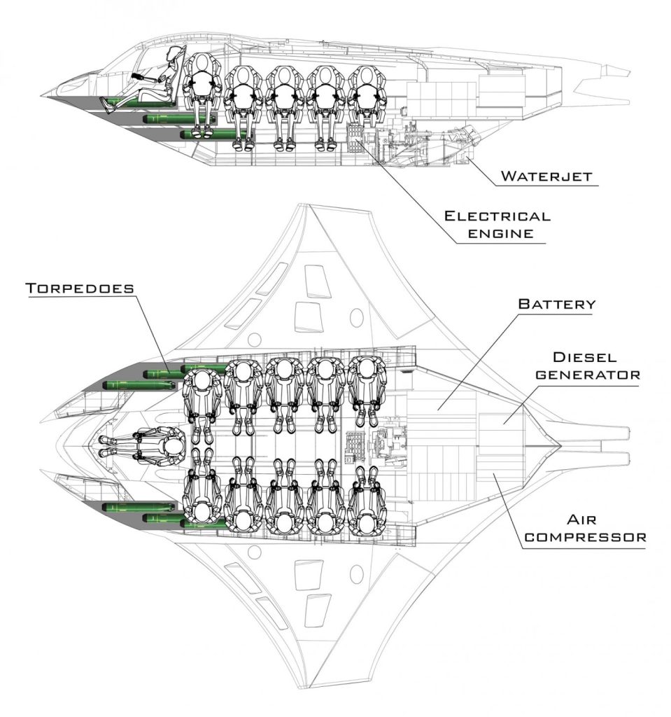 Как отмечают разработчики, рабочая глубина субмарины составляет 150 метров, критическая – до 250-ти. Скорость на воде – 80 км/ч, под водой – 50-т. Батарея способна работать 36 часов под водой, генератор – 18 часов. В гибридном режиме субмарина может не подниматься на поверхность в течение 54 часов.