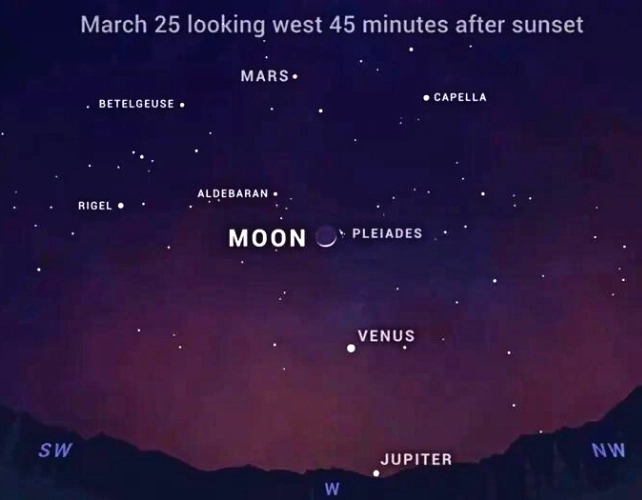 С 25 по 27 марта ярко-красный Марс будет "парить" высоко на юго-западе, над Луной и немного левее от нее, а с 28 марта он "переместится" под спутник Земли.