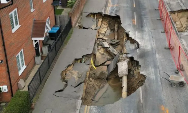 Гигантская воронка внезапно поглотила часть дороги в Годстоне – деревне в Суррее, Англия, вызвав срочную эвакуацию жителей.