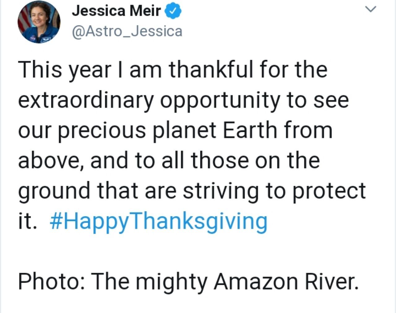 "В этом году я благодарна за невероятную возможность увидеть нашу драгоценную планету Земля с высоты и всем тем внизу, кто хочет защитить ее", - написала Меир.