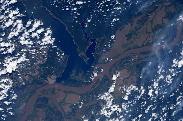 На фотографии с высоты космического полета изображена самая полноводная река мира - Амазонка. Это река в Южной Америке, самая длинная река в мире и самая полноводная. Ее основные истоки, Мараньон и Укаяли берут начало в Перуанских Андах и объединяются в один поток длиной 4000 км, что течет на восток через Бразилию.