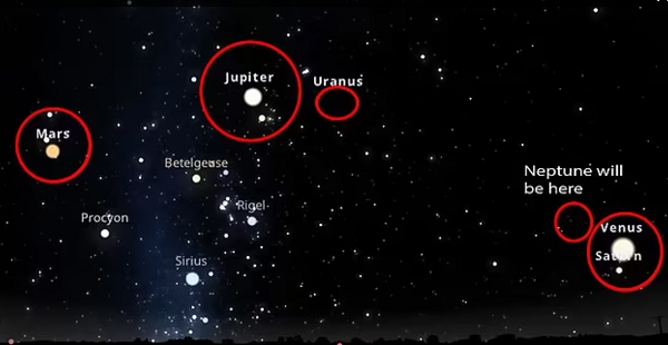 С 21 января Венера, Марс, Юпитер, Сатурн, Нептун и Уран будут расположены в одной линии в юго-восточной части неба. Парад планет происходит, когда несколько планет появляются на одной стороне Солнца. С Земли это создает впечатление, что все планеты расположены в длинной диагональной линии, простирающейся с востока на юг через ночное небо.